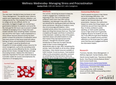 The main topic I decided to base my lesson on was “Stress Management.” The specific areas I chose to explore were organization, exercise, relaxation, and making time for fun. The transition from high school to college can be very difficult, and for me personally, my biggest struggle was maintaining a good balance between my academic and social life. My main goal for this lesson was to present multiple methods of managing stress in hopes that each student will take away something helpful.