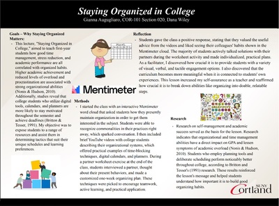 The lesson Staying Organized in College was designed to help first-year students understand how effective organizational strategies contribute to academic success, reduced stress, and improved time management. Research shows that students who use structured planning tools and intentional scheduling practices experience better academic performance and lower levels of overwhelm (Britton & Tesser, 1991; Nonis & Hudson, 2010). To introduce these skills, the lesson began with an interactive Mentimeter activity to assess students’ current habits, followed by short YouTube videos demonstrating real college organization systems. Students then completed a partner-based worksheet to reflect on their habits and create a personalized one-week plan. By combining technology, collaboration, and practical tools, the lesson aimed to help students explore a range of organizational methods and identify strategies that fit their individual needs.