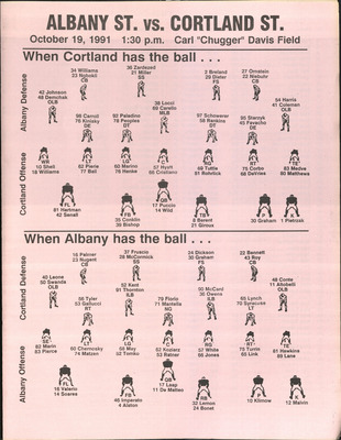 This collection includes programs and team guides from 1924-2002 for Cortland Football. These detail different games over the years, coaching staff, players, statistics, and schedules.