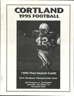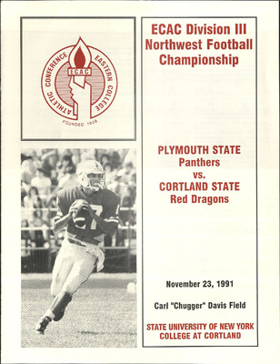 This publication includes information on schedules, coaches, player profiles, records, and team photographs. SUNY Cortland hosted Plymouth State University to compete for the ECAC Division III Northwest Football Championship.