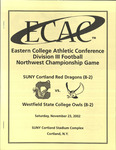 This publication includes information on schedules, coaches, player profiles, records, and team photographs. SUNY Cortland hosted Westfield State College for the ECAC Northwest Football Championship.