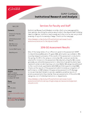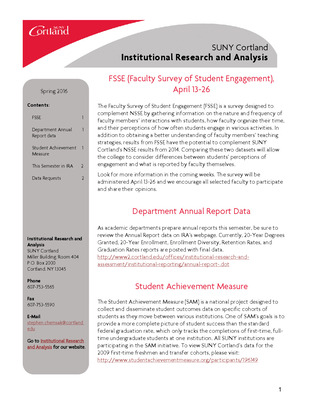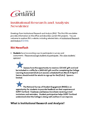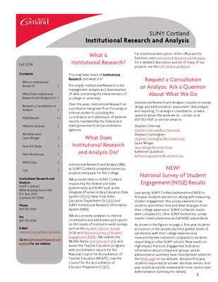 Newsletter of the SUNY Cortland Institutional Research and Analysis office which provides updates on office research, ongoing projects, and provides contact information.