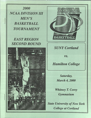 This publication includes information on schedules, coaches, player profiles, and records. SUNY Cortland played host to the NCAA DIII Men's Basketball Tournament East Region Second Round against Hamilton College.
