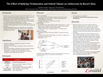 Bullying victimization and school climate have been found to predict adolescents' depression in western countries. However, it was unknown how these factors may affect adolescents in other countries such as Chinese rural adolescents. We aimed to examine whether bullying victimization and school climate interacted to predict Chinese rural adolescents' depression. Participants were 705 adolescentes (60.7% female, M = 16.7, SD = 0.996, age range: 11-20 years), and they were recruited from a boarding school in rural China. Adolescents reported on school climate, depression and bullying victimization. Results stated that bullying victimization positively predicted adolescents’ depression and the prediction was stronger when school climate was better as compared to a more negative school climate. Therefore, depending on the social, economic or environmental context that the adolescent is in, it could make them more vulnerable to the impact that bullying victimization and school climate create.