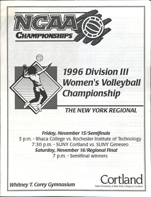 The 1996 NCAA Division III Women's Volleyball Championship, the New York Regional, took place at SUNY Cortland on November 15-16, 1996. The championship included SUNY Cortland, Ithaca, Rochester Institute of Technology, and Geneseo.