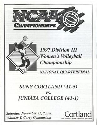 The 1997 NCAA Division III Women's Volleyball Championship, National Quarterfinal, took place at SUNY Cortland on November 22, 1997. SUNY Cortland vs. Juniata College.