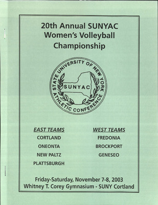 The 2003 SUNYAC (State University of New York Athletic Conference) Women's Volleyball Championship, took place at SUNY Cortland on November 7-8, 2003. The championship included SUNY Cortland, Oneonta, New Paltz, Plattsburgh, Fredonia, Brockport, and Geneseo.