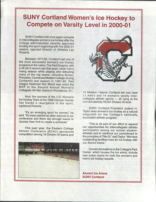 Single leaflet announcing the relaunch of the Women's Ice Hockey team in the 2000-2001 NCAA Division III Women's Hockey season, its hiring of a head coach, and mention of the program's history from 1977-1982.